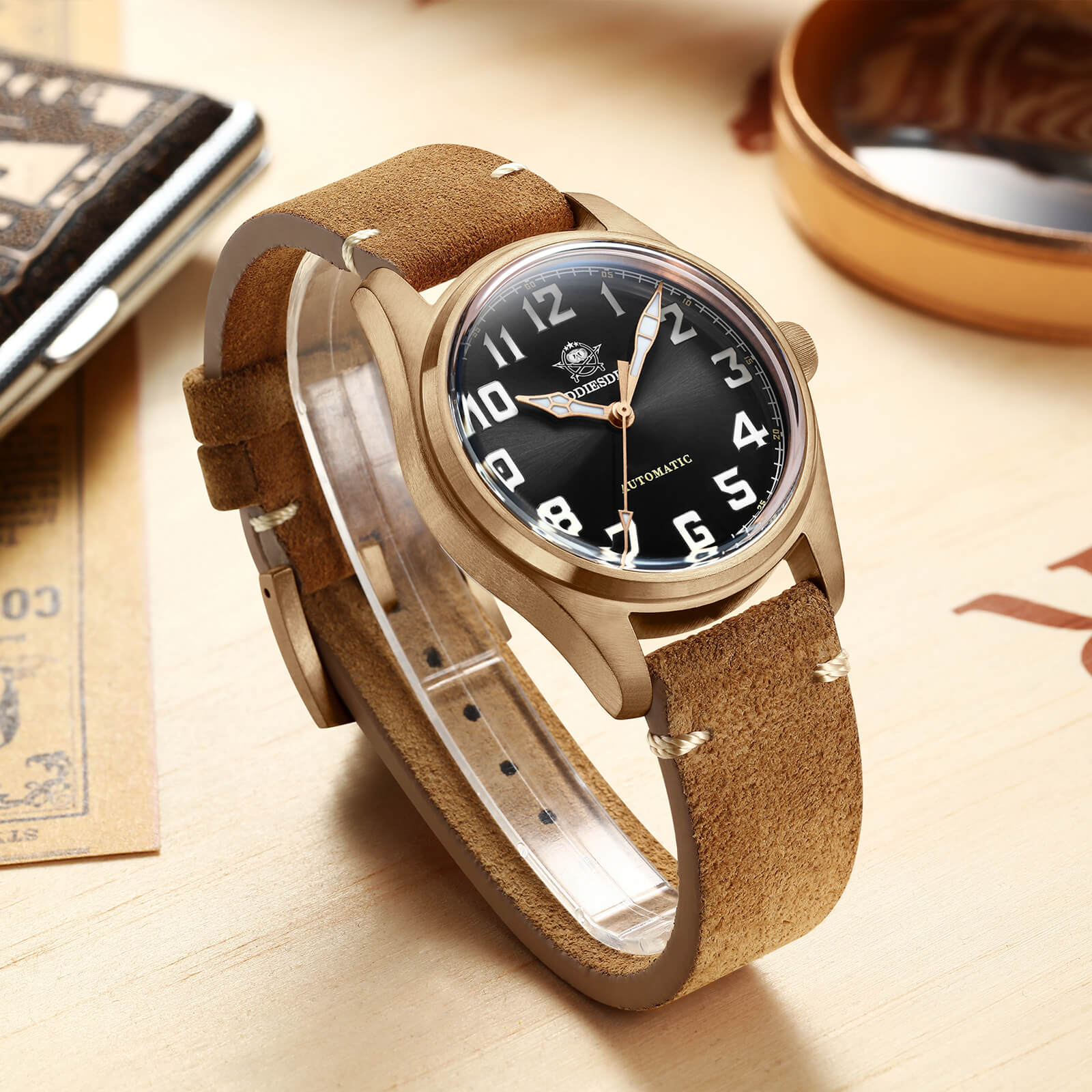 - â Exklusives Material: GehĂ€use und DornschlieĂe aus massiver CUSN8 Bronze fĂŒr einen einzigartigen Vintage-Look.